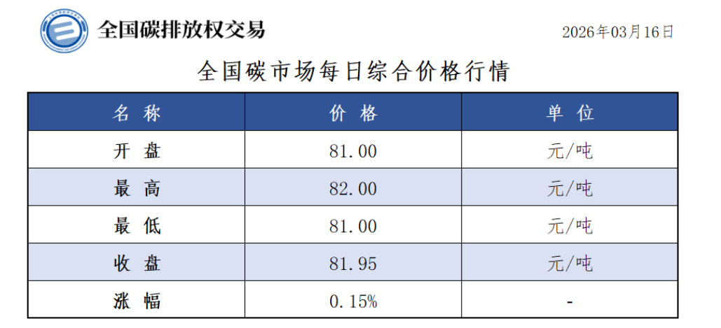 今日全国碳市场综合价格行情为: 开盘价81.00元/吨,最高价82.00元/吨,最低价81.00元/吨,收盘价81.95元/吨,收盘价较前一日上涨0.15%。