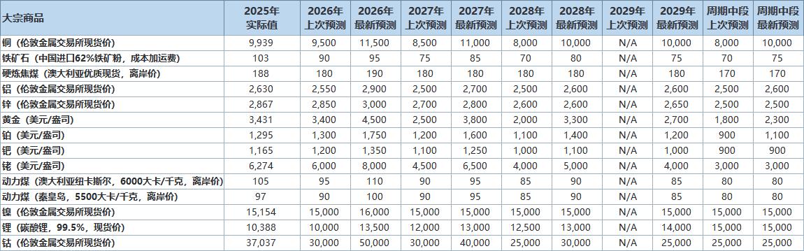 铜:整个周期内铜价格预期的上调反映了电气化(包括电网升级和数据中心建设)带来的需求增长。市场供需依然保持紧平衡,库存水平极低;近期供应中断也推高了价格。尽管一些发达市场能源转型政策的实施速度有所放缓,但铜价依然走高。周期中期价格上涨反映了现有矿山矿石品位下降,而新项目审批速度受到繁琐的审批流程以及强劲的需求基本面的制约。