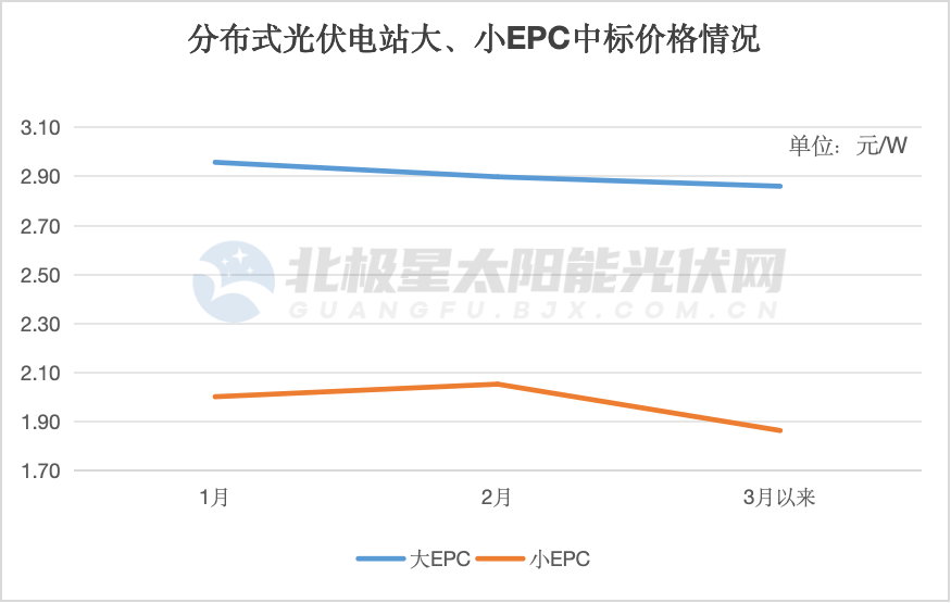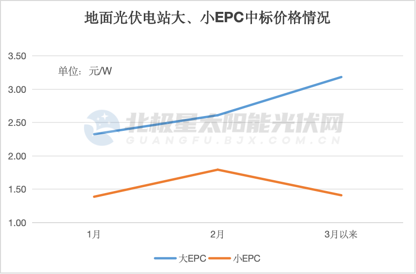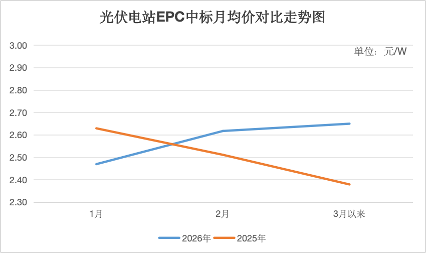 具体到价格来看,2026年开年的光伏EPC价格走出了与2025年“截然相反”的行情,除1月同比微降外,2、3月价格稳步回升。