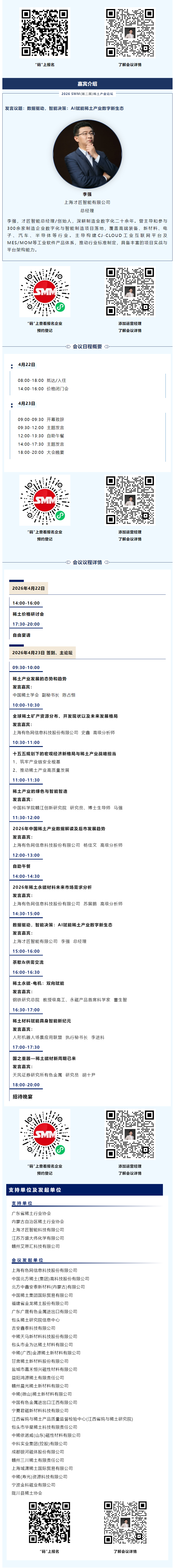 在此背景下,深入剖析AI赋能稀土产业发展的现状与机遇尤为重要。2026年4月22-23日,由上海有色网主办的2026 SMM(第三届)稀土产业论坛特邀上海才匠智能有限公司 总经理 李强 主讲《数据驱动,智能决策:AI赋能稀土产业数字新生态 》,推动探索稀土产业迈向新高度的拓展路径。