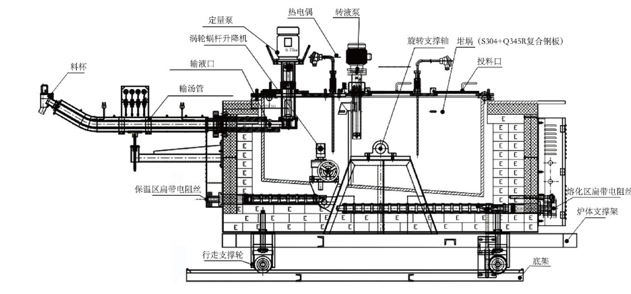 将镁锭投入坩埚中,使用电加热技术,通过扁带电阻丝(镍铬合金/铁铬合金)加热熔化镁锭,由转液泵将熔化后的镁液抽取至保温区,保温区熔化的镁液经定量泵抽送至输汤管,注入压铸机模具中压铸镁合金定量炉熔化坩埚: