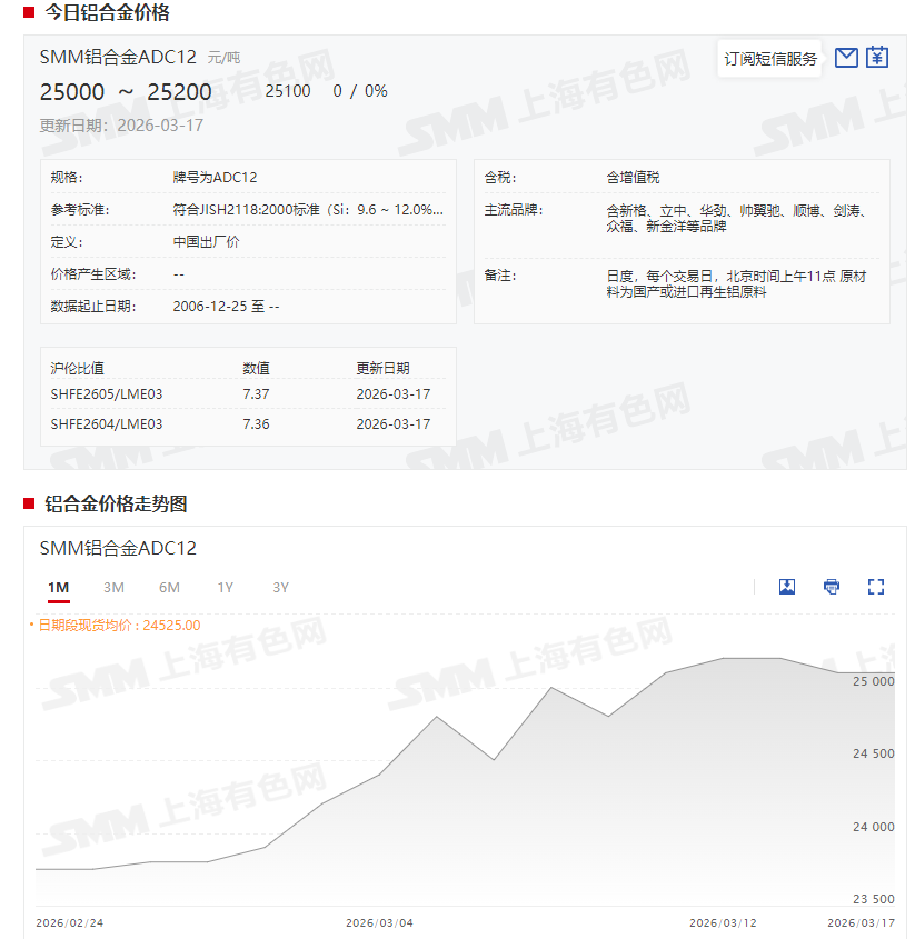 着眼当前的再生铝合金市场,截至3月17日,SMM铝合金ADC12现货报价暂时持稳于25000~25200元/吨,均价报25100元/吨。