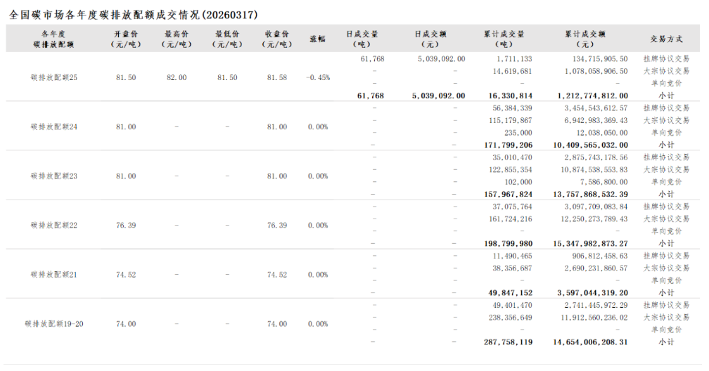 2026年1月1日至3月17日,全国碳市场碳排放配额成交量17,636,575吨,成交额1,316,623,545.60元。
