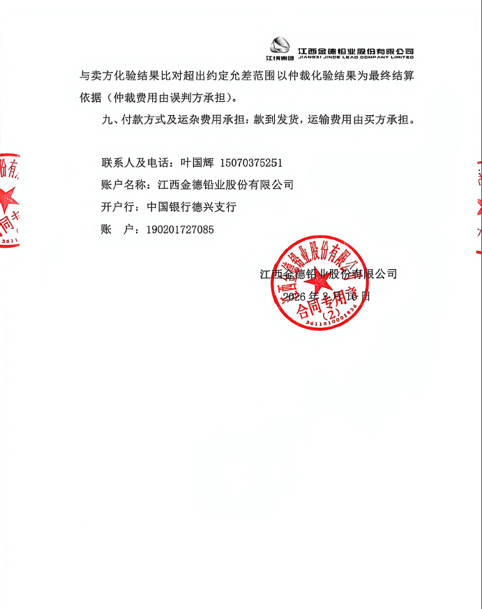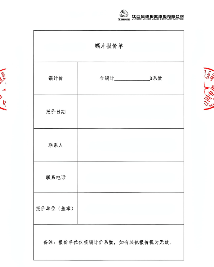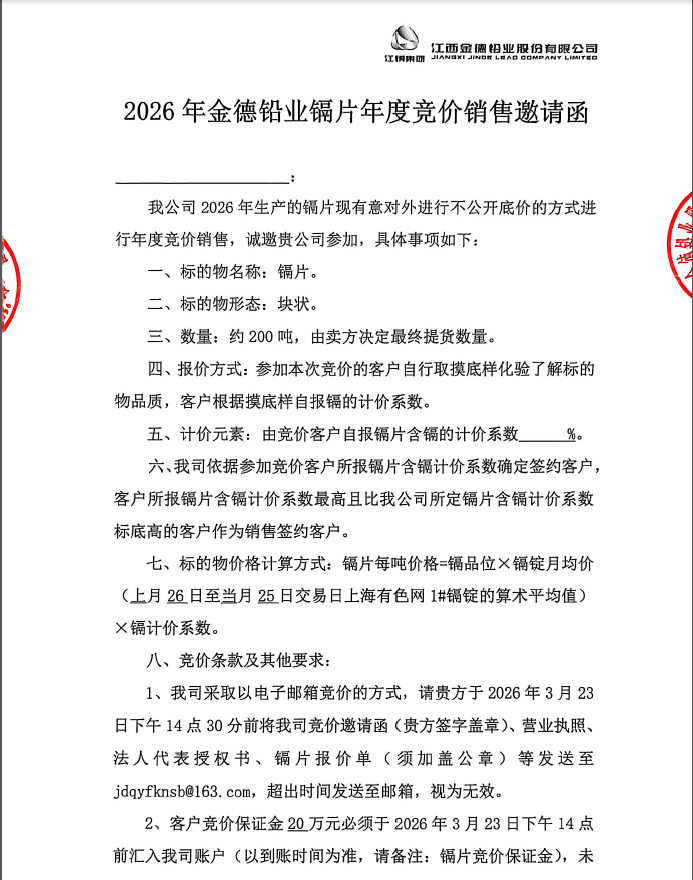 近日,江西金德铅业股份有限公司发布2026年金德铅业镉片年度竞价销售邀请函,销售数量约 200 吨,由卖方决定最终提货数量。报价方式为参加本次竞价的客户自行取摸底样化验了解标的物品质,客户根据摸底样自报镉的计价系数。
