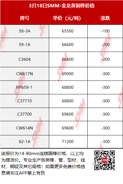【SMM价格】2026年3月18日金龙黄铜棒价格
