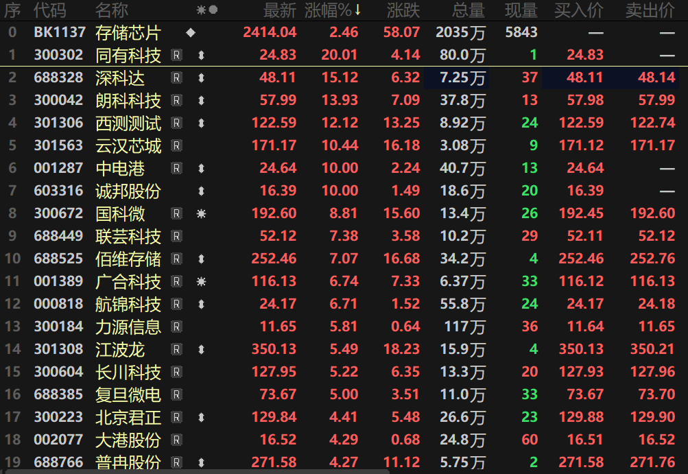 SMM 3月18日讯:今日早间,存储芯片开盘便迅速走强,指数盘中涨逾2%,整体表现活跃。个股方面,同有科技盘中20CM拉升涨停,朗科科技涨逾14%,诚邦股份、中电港盘中也一度封死涨停板,佰维存储、江波龙、普冉股份等多股纷纷涨逾7%。