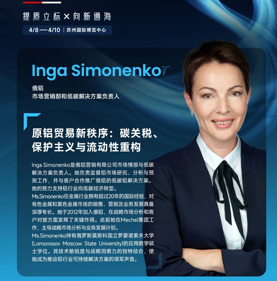 在此背景下,SMM AICE(第二十一届)铝业大会暨铝产业博览会特邀俄铝市场营销部和低碳解决方案负责人 Inga Simonenko 女士,于2026年4月9日,《原铝贸易新秩序:碳关税、保护主义与流动性重构》专题发言,深度剖析全球铝贸易格局重构的挑战与机遇。
