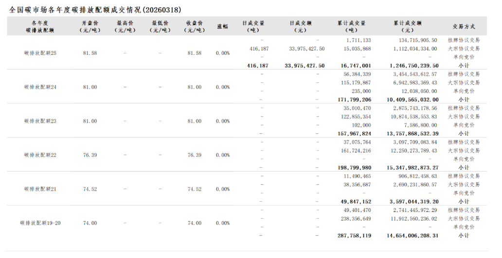 2026年1月1日至3月18日,全国碳市场碳排放配额成交量18,052,762吨,成交额1,350,598,973.10元。