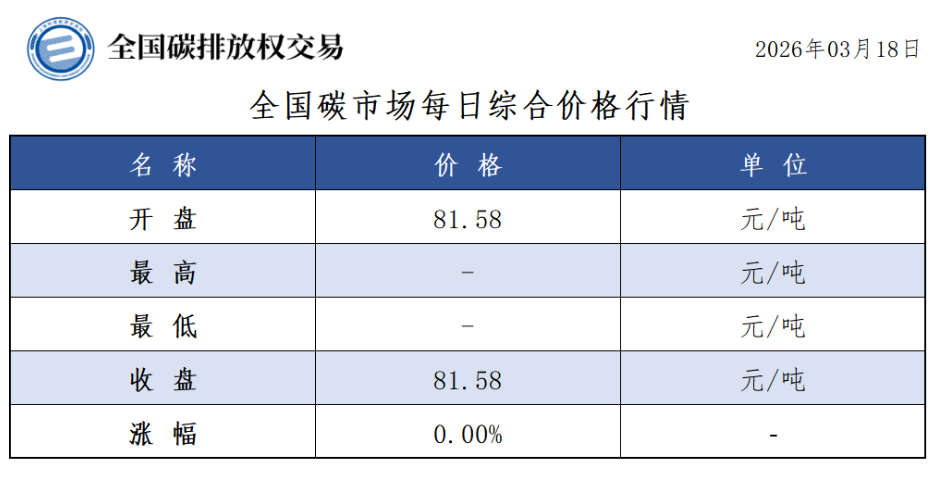 今日全国碳市场综合价格行情为: 开盘价81.58元/吨,收盘价81.58元/吨,收盘价与前一日持平。