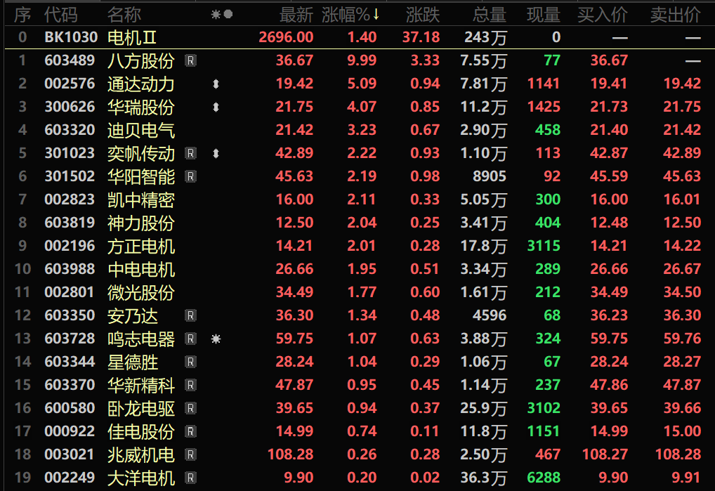 国家电网1~2月固定资产投资累计完成757亿元,同比增长80.6%,电网基础支撑和投资拉动效应显著。受电网投资大超预期的提振,电机作为电网核心设备,直接受益于订单放量与产能利用率提升。算电协同 + AI 算力爆发,打开工业 / 伺服电机新的需求空间。稀土 / 钽价高企等倒逼高效电机替代加速,部分市场资金的青睐以及八方股份等电机板块个股业绩的预喜等均提振了电机板块的市场表现,截至3月18日收盘,电机行业涨1.4%,个股方面:八方股份涨停,通达动力、华瑞股份、迪贝电气、奕帆传动以及华阳智能等涨幅居前。