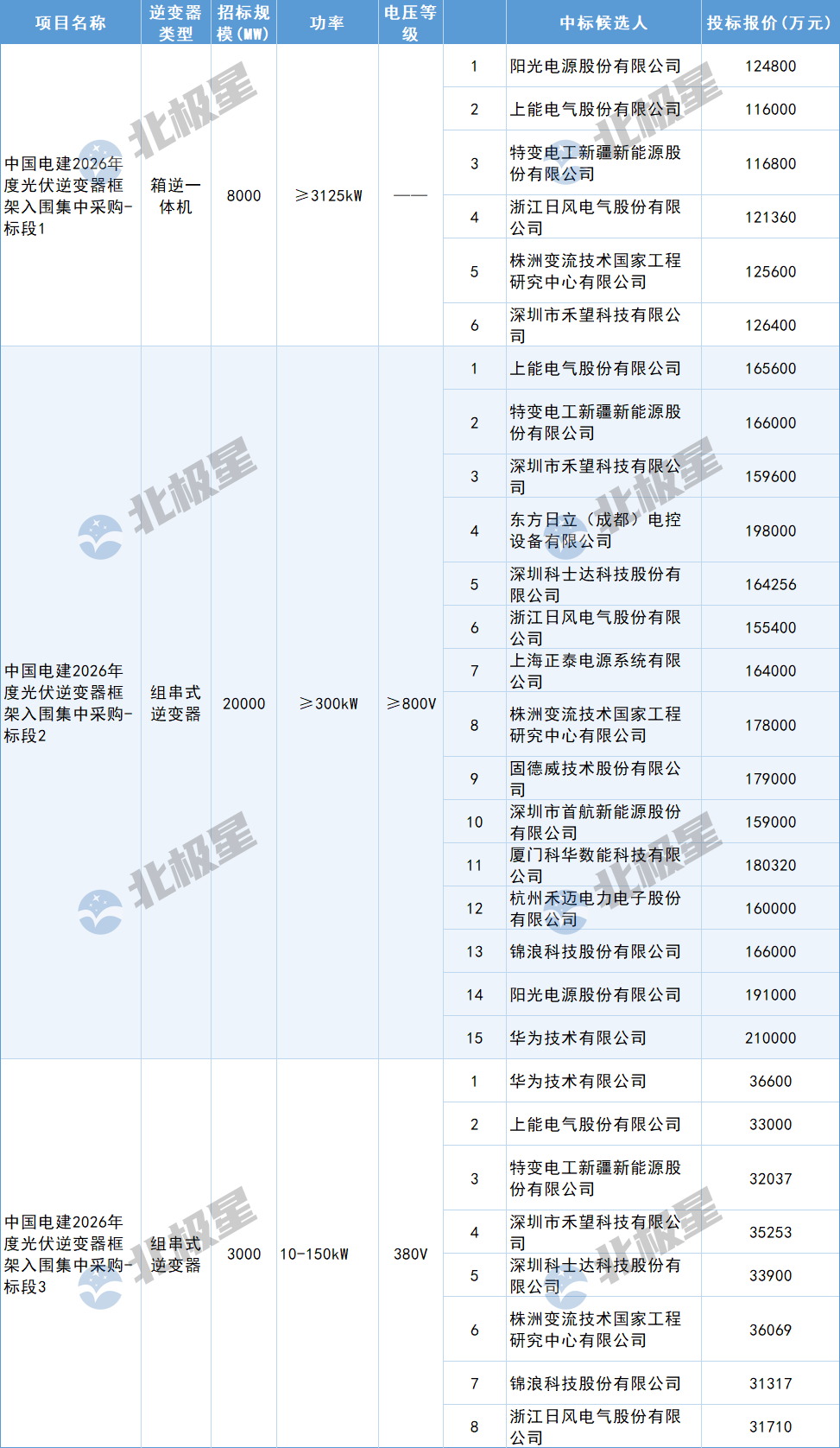 3月18日,中国电建2026年度光伏逆变器框架入围集中采购项目候选入围供应商公示,入围企业有阳光电源股份有限公司、上能电气股份有限公司、特变电工新疆新能源股份有限公司、浙江日风电气股份有限公司、株洲变流技术国家工程研究中心有限公司、深圳市禾望科技有限公司、东方日立(成都)电控设备有限公司、深圳科士达科技股份有限公司、上海正泰电源系统有限公司、固德威技术股份有限公司、深圳市首航新能源股份有限公司、厦门科华数能科技有限公司、杭州禾迈电力电子股份有限公司、锦浪科技股份有限公司、华为技术有限公司。