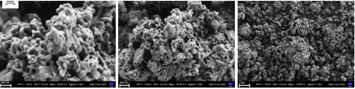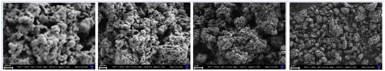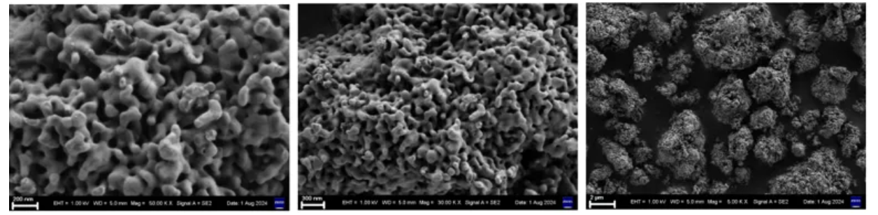 铵法二步法工艺产品铁磷比及比表稳定、杂志含量低、各项数据指标管控范围窄。易后端掺杂调控;比表面积较高,内部疏松多孔,易于研磨;一次粒子均匀,均值为100nm左右类球形一次粒子,组成蜂窝状二次颗粒。