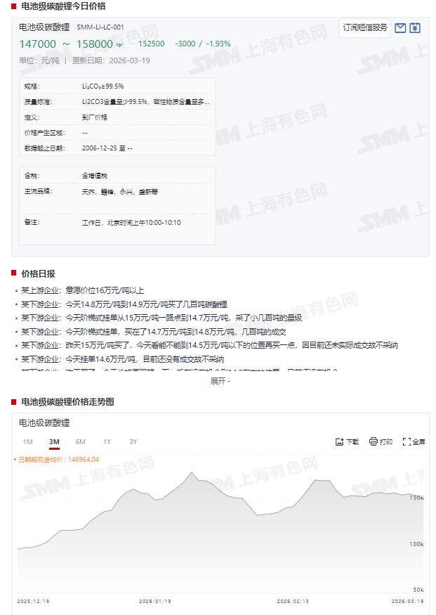 进入3月份,碳酸锂现货报价呈现震荡运行的态势,截至3月19日,电池级碳酸锂报147000~158000元/吨,均价报152500元/吨。