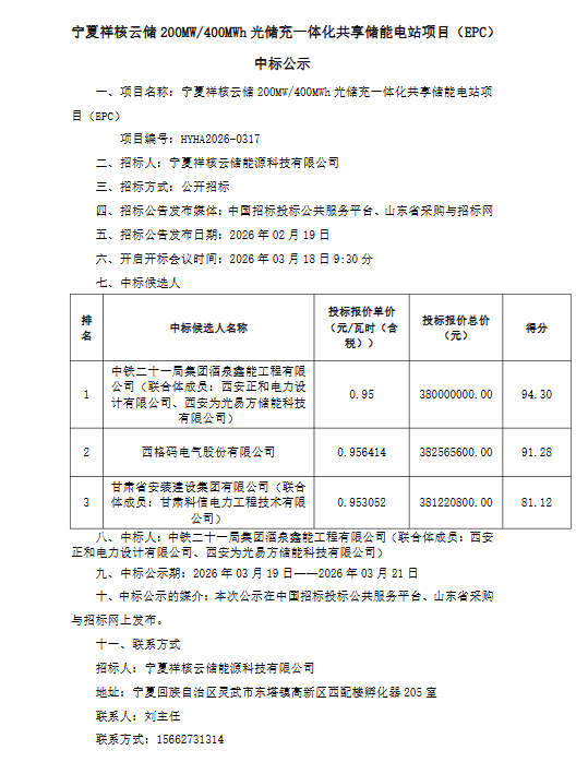 除第一中标候选人外,西格码电气股份有限公司以约0.956元/Wh的报价位列第二;甘肃省安装建设集团有限公司(联合体成员:甘肃科信电力工程技术有限公司)以约0.953元/Wh的报价位列第三。