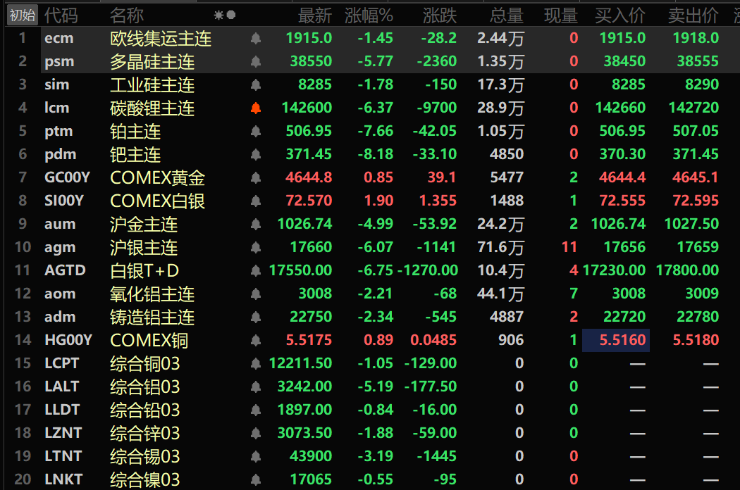 隔夜贵金属方面:COMEX黄金跌4.99%,COMEX白银跌6.16%。内盘贵金属方面:隔夜沪金跌4.99%,沪银跌6.07%。