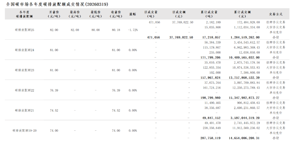 2026年1月1日至3月19日,全国碳市场碳排放配额成交量18,523,818吨,成交额1,388,367,995.60元。