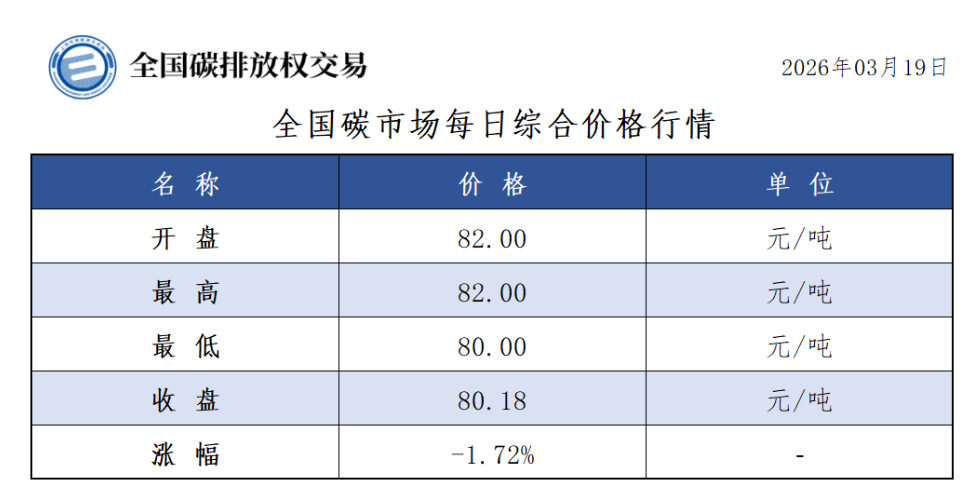 今日全国碳市场综合价格行情为: 开盘价82.00元/吨,最高价82.00元/吨,最低价80.00元/吨,收盘价80.18元/吨,收盘价较前一日下跌1.72%。
