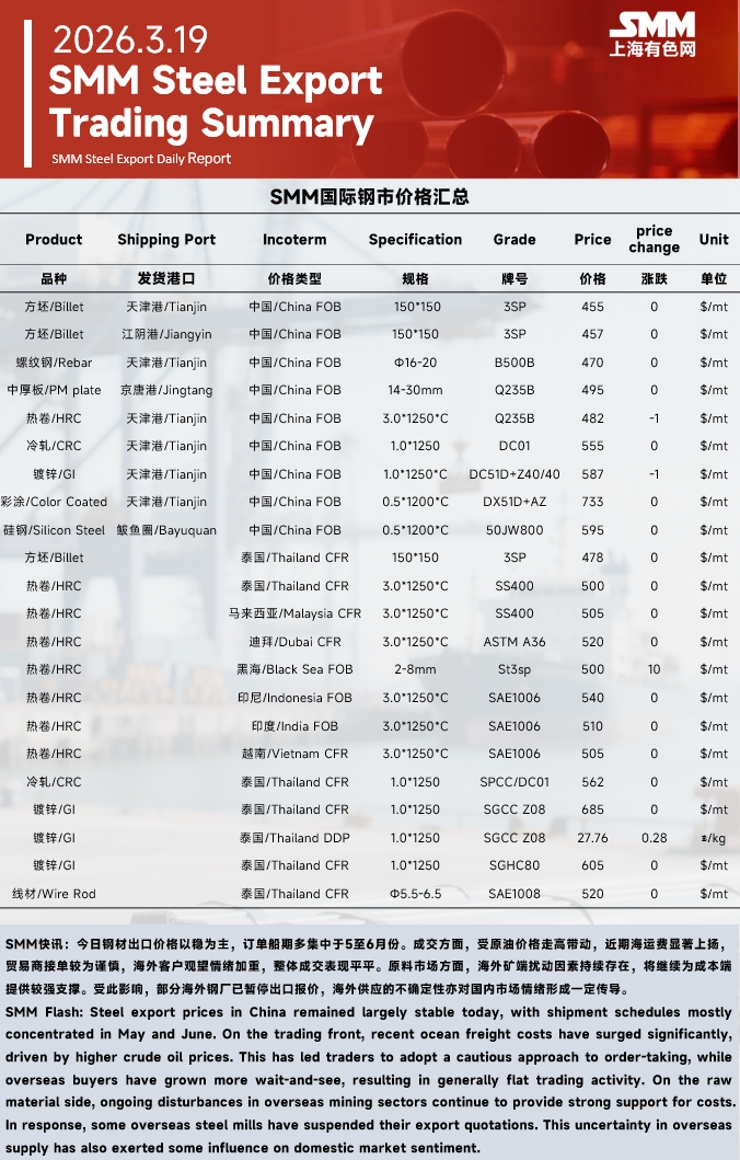 SMM快讯:今日钢材出口价格以稳为主,订单船期多集中于5至6月份。成交方面,受原油价格走高带动,近期海运费显著上扬,贸易商接单较为谨慎,海外客户观望情绪加重,整体成交表现平平。原料市场方面,海外矿端扰动因素持续存在,将继续为成本端提供较强支撑。受此影响,部分海外钢厂已暂停出口报价,海外供应的不确定性亦对国内市场情绪形成一定传导。