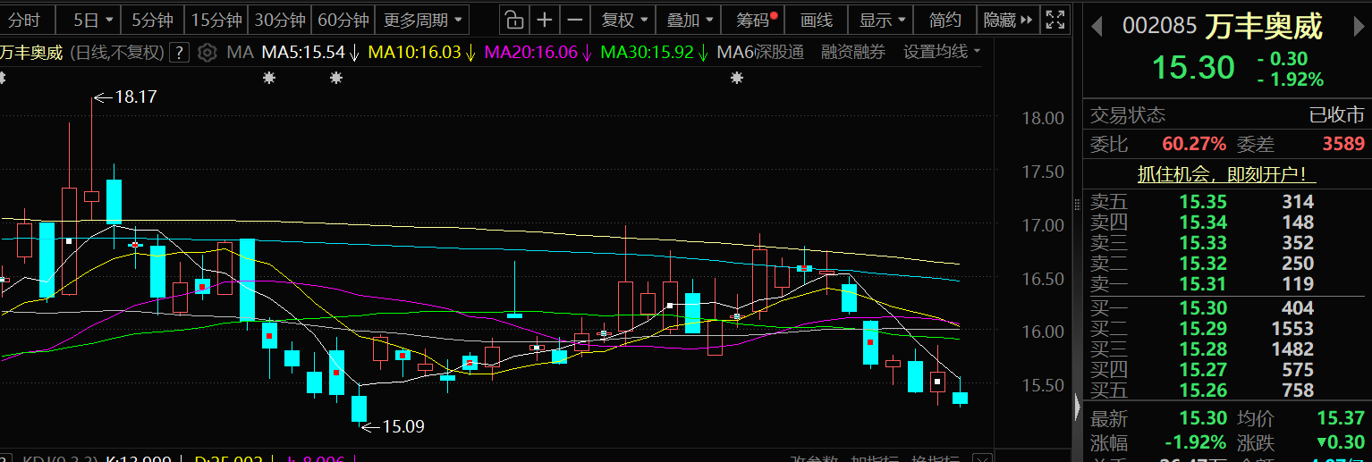 3月19日,万丰奥威股价出现下跌,截至19日收盘,万丰奥威跌1.92%,报15.3元/股。
