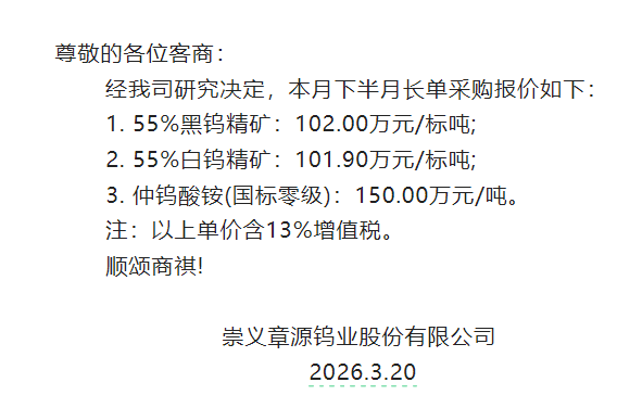 据崇义章源钨业3月20日消息:崇义章源钨业股份有限公司3月下半月的长单采购报价如下:1. 55%黑钨精矿:102万元/标吨,较上轮报价上调12万元/标吨;2. 55%白钨精矿:101.9万元/标吨,较上轮报价上调12万元/标吨;3. 仲钨酸铵(国标零级):150万元/吨,较上轮报价上调17万元/吨。