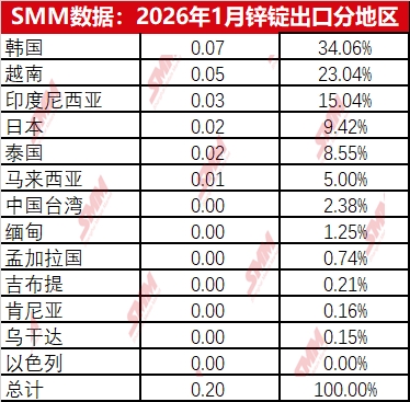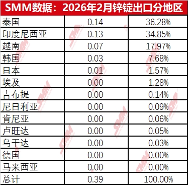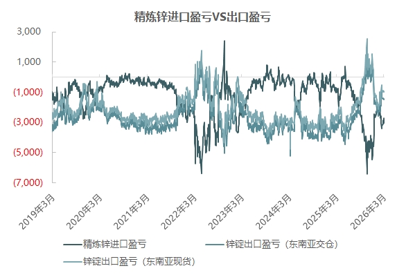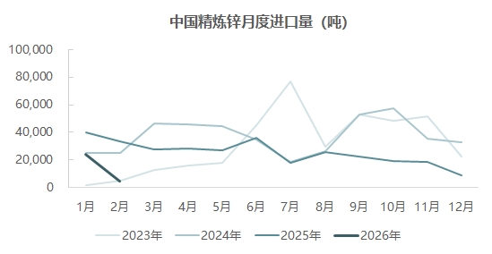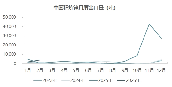 根据最新的海关数据显示,2026年1月精炼锌进口量2.41万吨,环比增加1.53万吨,2月精炼锌进口0.45万吨,环比下降1.96万吨或环比下降81.26%,同比下降86.58%,1-2月精炼锌累计进口2.86万吨,累计同比下降61%。1月精炼锌出口0.2万吨,2月出口0.38万吨,即1-2月精炼锌净出口2.28万吨。