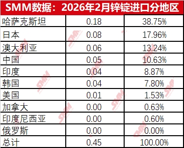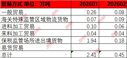从分国别数据来看,1-2月精炼锌进口的主要国家是哈萨克斯坦和澳大利亚,其中1月哈萨克斯坦锌锭进口量占比90%以上,从贸易方式来看主要是保税区货物流入,非一般贸易方式流入;出口方面主要是以东南亚国家少量流出,因进出口窗口双双关闭整体出口量维持低位。