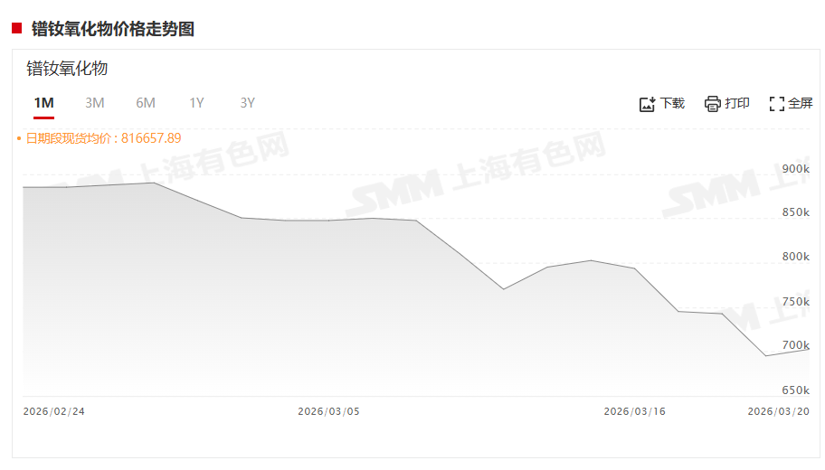 据SMM报价显示:氧化镨钕3月20日的价格为700000~705000元/吨,其均价为702500元/吨,较其前一交易日上涨7500元/吨,涨幅为1.08%。
