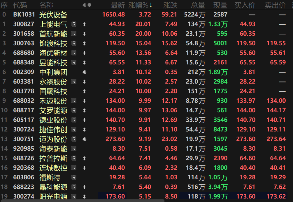光伏设备个股方面,上能电气、首航新能股价一同20CM涨停,艾罗能源、锦浪科技、昱能科技等多股涨逾10%,中利集团、德业股份一同涨停。