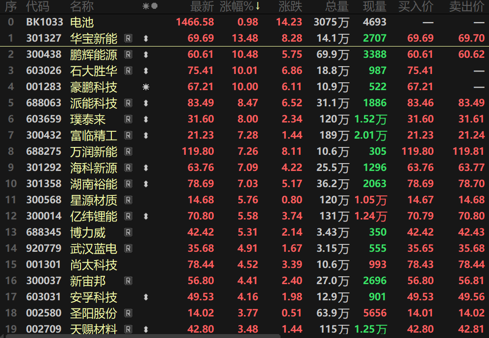 电池个股方面,华宝新能涨逾12%,石大胜华盘中一度封死涨停板,璞泰来、鹏辉能源、武汉蓝电、派能科技、亿纬锂能等多股一同涨逾6%。
