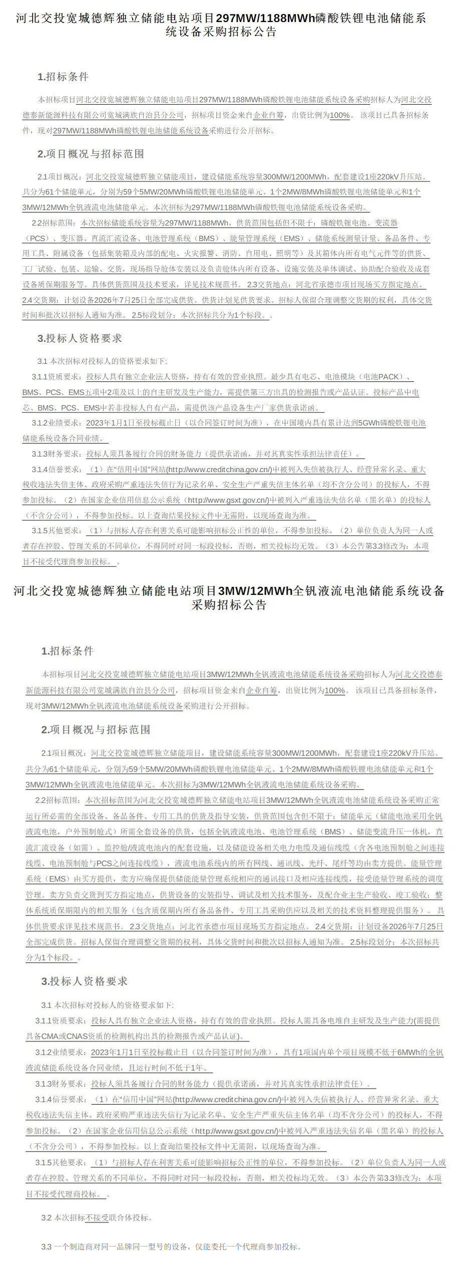 北极星储能网讯:2026年3月19日,河北交投宽城德辉独立储能电站项目300MW/1200MWh电池储能系统设备采购发布招标公告,项目建设储能系统容量300MW/1200MWh,配套建设1座220kV升压站。共分为61个储能单元,分别为59个5MW/20MWh磷酸铁锂电池储能单元、1个2MW/8MWh磷酸铁锂电池储能单元和1个3MW/12MWh全钒液流电池储能单元。