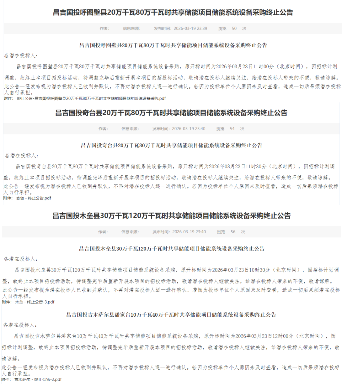 北极星储能网讯:2026年3月19日,昌吉国投发布4个共享储能项目储能系统设备采购终止公告,规模共计800MW/3.2GWh,终止原因皆为招标计划有调整,招标时均不允许联合体投标。