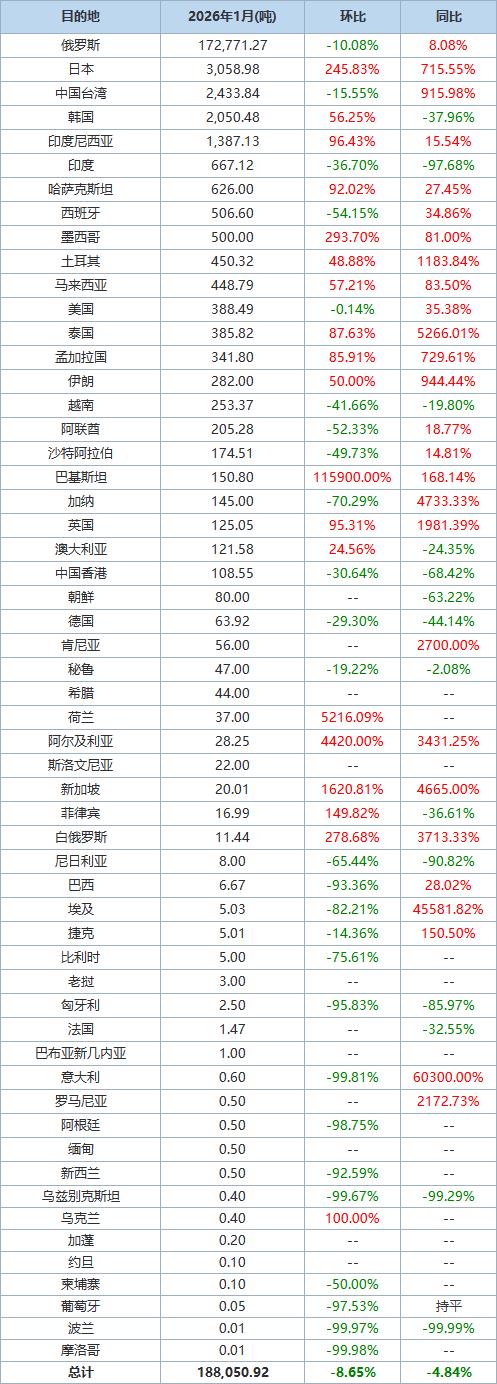 以下为根据中国海关总署官网数据整理的2026年1月氧化铝出口分项数据一览表: