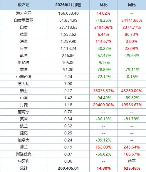 以下为根据中国海关总署官网数据整理的2026年1月氧化铝进口分项数据一览表: