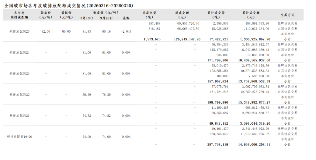 2026年1月1日至3月20日,全国碳市场碳排放配额成交量18,728,482吨,成交额1,404,774,601.50元。