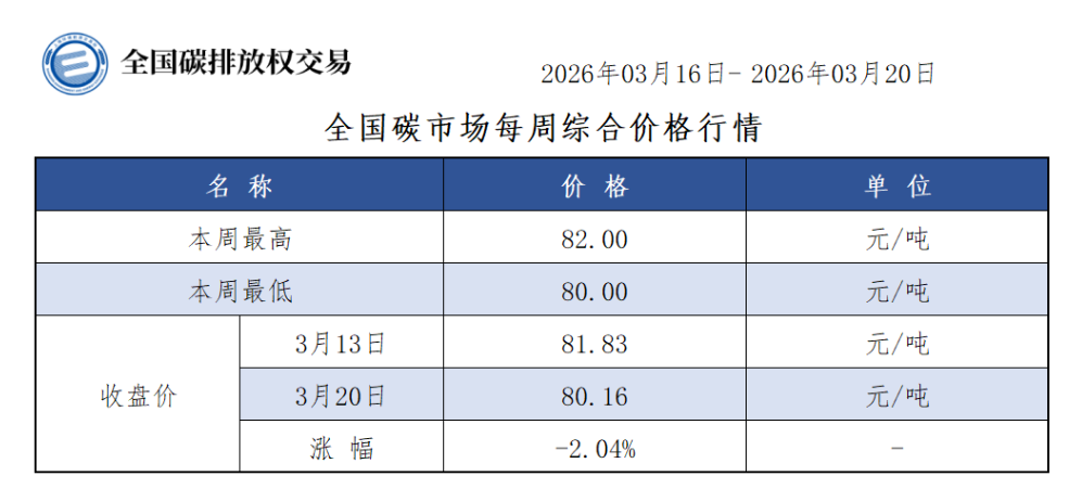 本周全国碳市场综合价格行情为:最高价82.00元/吨,最低价80.00元/吨,收盘价较上周五下跌2.04%。