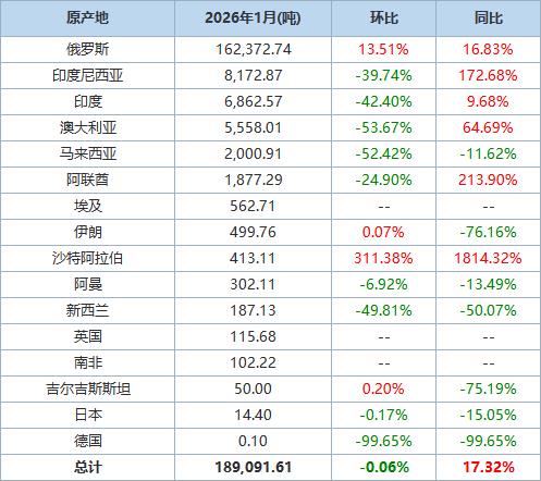 以下为根据海关总署官网数据整理的2026年1月原铝进口分项数据一览表: