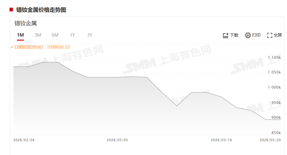 据SMM报价显示,3月20日,镨钕金属价格为890000~910000元/吨,其均价为900000元/吨,均价较前一交易日持平。