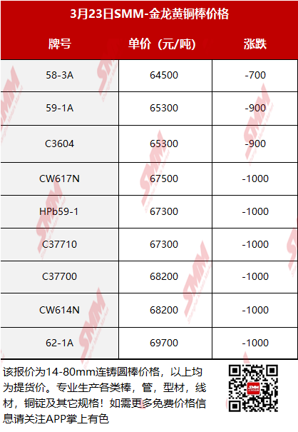 【SMM价格】2026年3月23日金龙黄铜棒价格