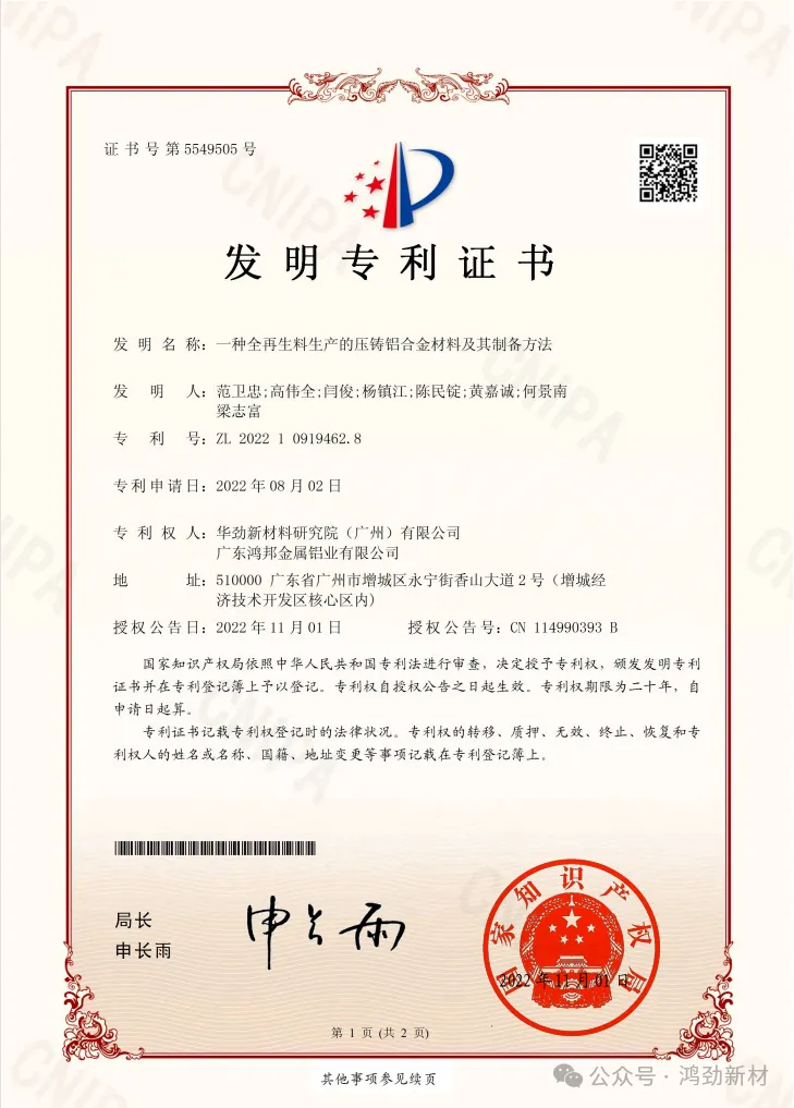 近日,由鸿劲新材集团旗下华劲新材料研究院 (广州) 有限公司(下简称“广州研究院”)与广东鸿邦金属铝业有限公司联合研发的“一种全再生料生产的压铸铝合金材料及其制备方法”发明专利,正式获得中国国家知识产权局(专利号:2022109194628)与美国专利商标局(PCT/CN2022/109890)双重授权!这不仅是中国企业在再生铝高端材料领域的一次重大技术突围,更为全球压铸行业提供了一套兼具低碳属性与高性能表现的“中国方案”。