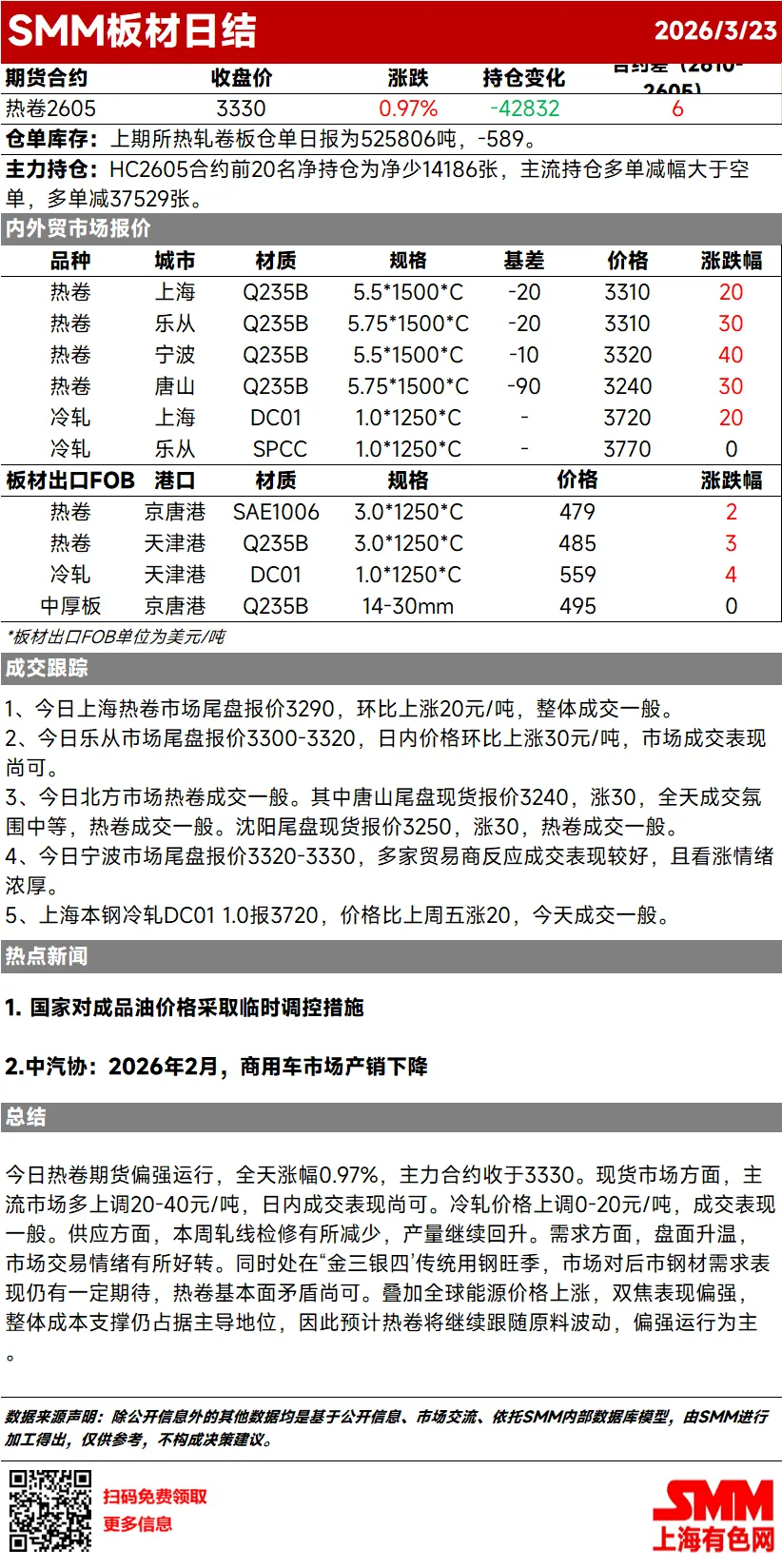 今日热卷期货偏强运行,全天涨幅0.97%,主力合约收于3330。现货市场方面,主流市场多上调20-40元/吨,日内成交表现尚可。冷轧价格上调0-20元/吨,成交表现一般。供应方面,本周轧线检修有所减少,产量继续回升。需求方面,盘面升温,市场交易情绪有所好转。同时处在“金三银四’传统用钢旺季,市场对后市钢材需求表现仍有一定期待,热卷基本面矛盾尚可。叠加全球能源价格上涨,双焦表现偏强,整体成本支撑仍占据主导地位,因此预计热卷将继续跟随原料波动,偏强运行为主。