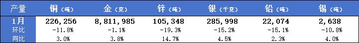 以下为秘鲁1月主要金属产量: