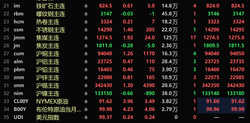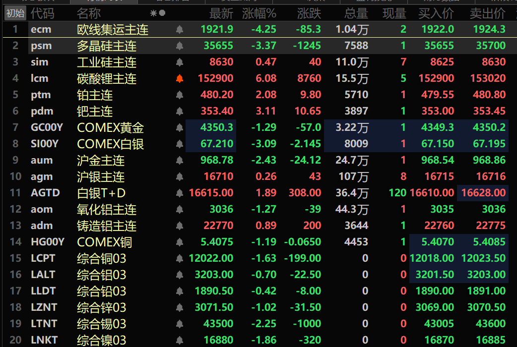 此外,截至午间收盘,铂主连期货涨2.08%,钯主连期货涨3.11%。