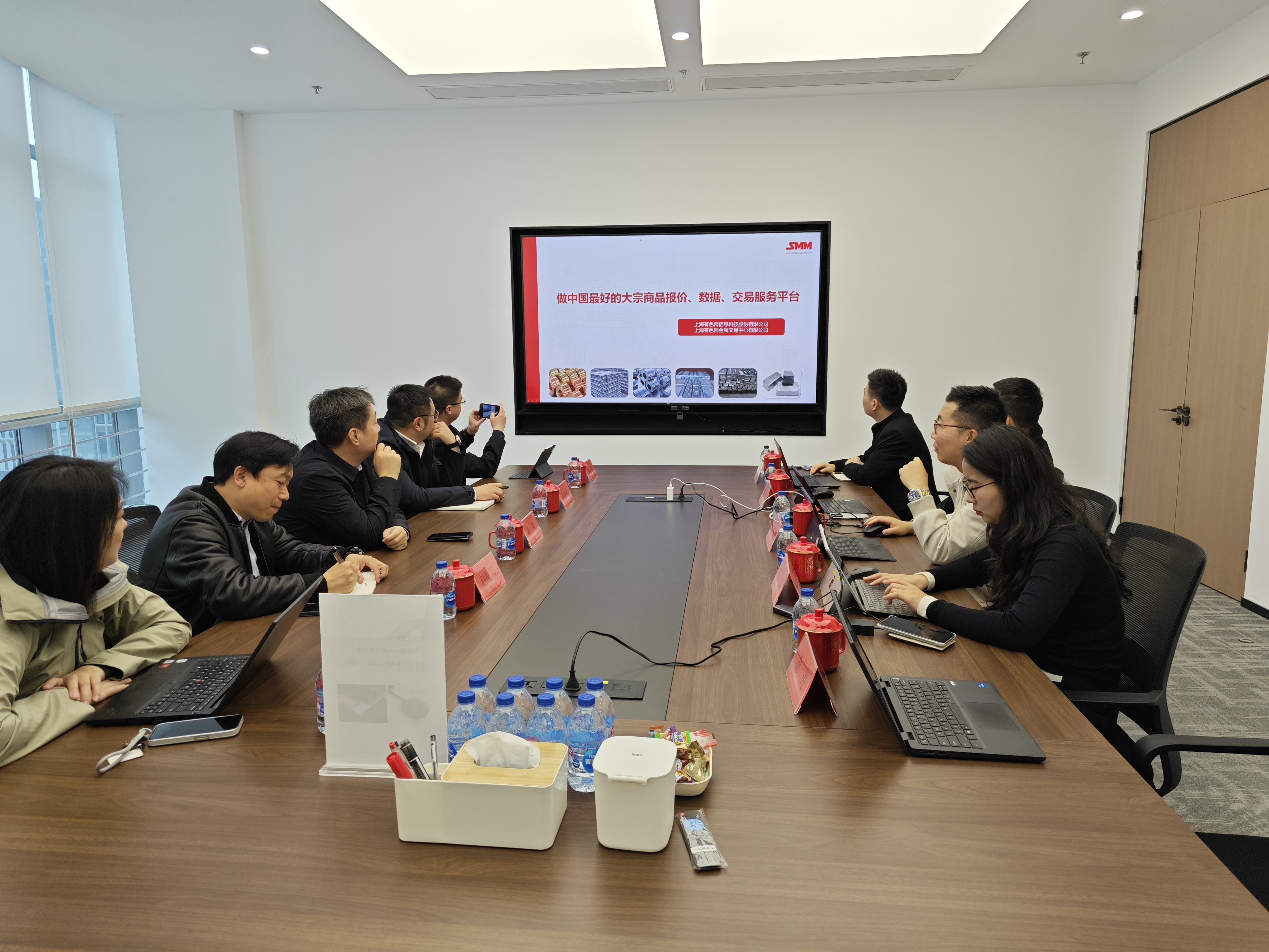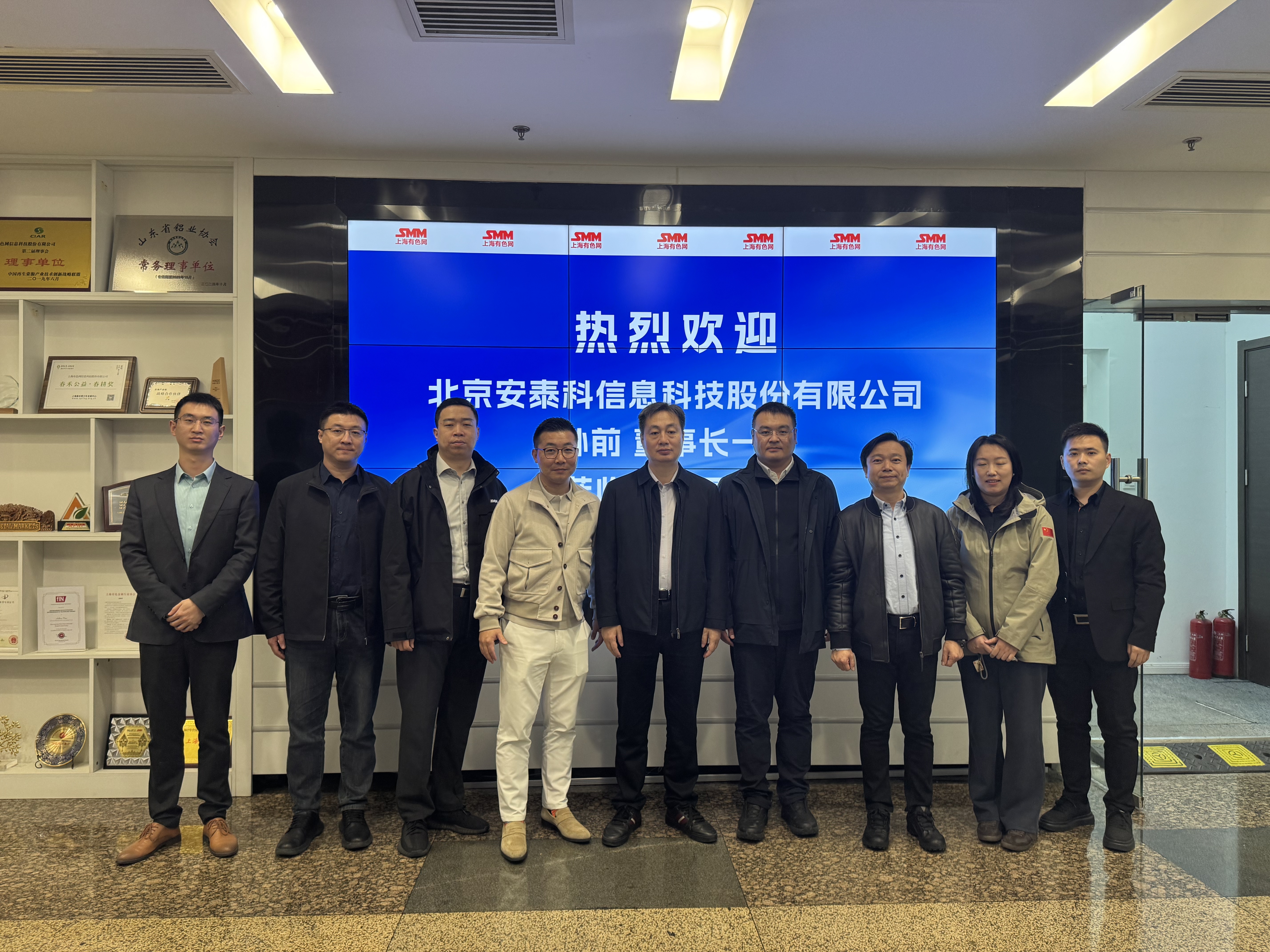 3月24日,北京安泰科信息科技股份有限公司董事长孙前、常务副总经理孙照吉、副总经理赵振军、总经理助理裴立双 、市场信息部经理李峒峒一行到访上海有色网信息科技股份有限公司(SMM)考察交流,SMM CEO 卢嘉龙、 执行副总裁周柏、副总裁王聪、高级总监俞进、高级经理羊锦明等热情接待了来访嘉宾。