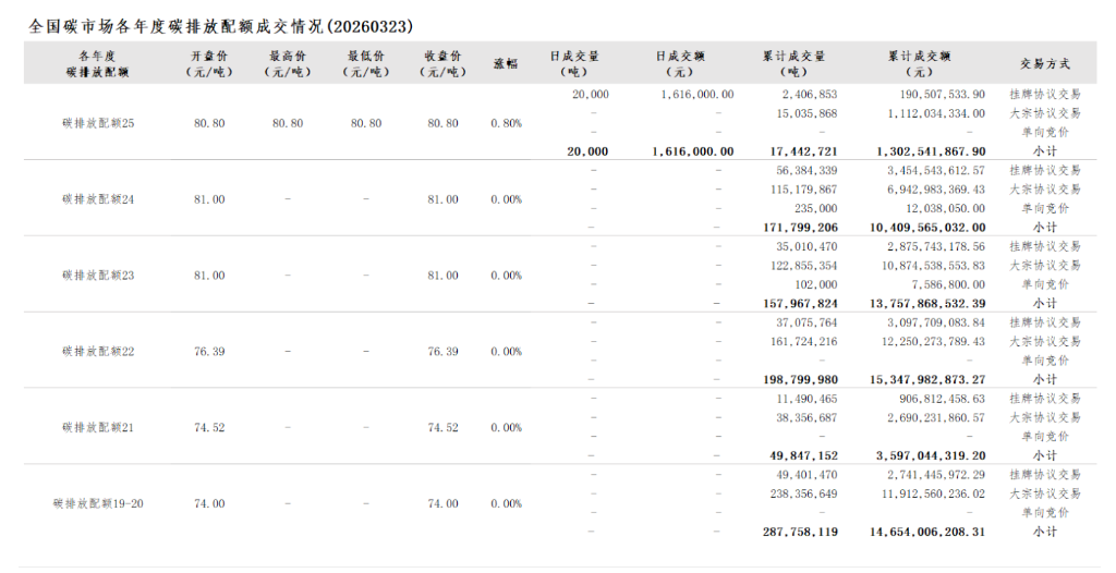2026年1月1日至3月23日,全国碳市场碳排放配额成交量18,748,482吨,成交额1,406,390,601.50元。