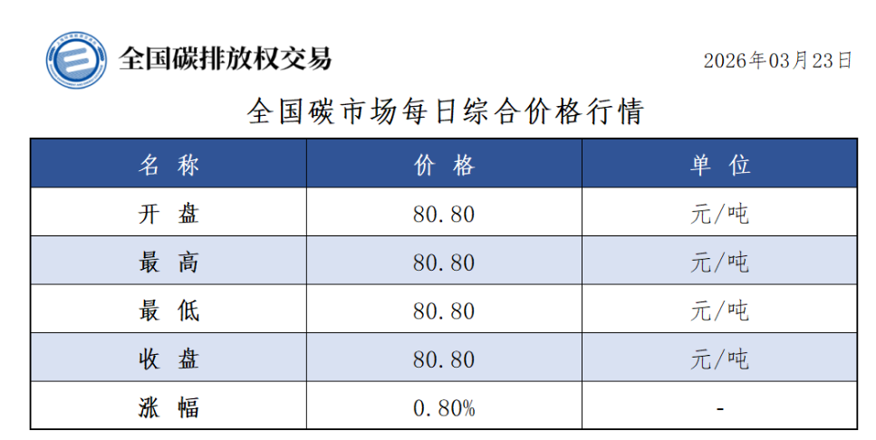 今日全国碳市场综合价格行情为: 开盘价80.80元/吨,最高价80.80元/吨,最低价80.80元/吨,收盘价80.80元/吨,收盘价较前一日上涨0.80%。