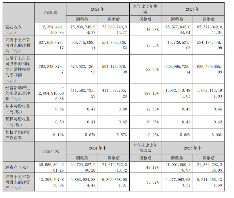 恒邦股份3月25日披露2025年年度报告显示:2025 年,公司实现营业收入 11,239,444.00 万元,较上年同期增长 48.28%,主要系本期产品销售价格与销售量增加所致;营业成本为 11,011,162.16 万元,较上年同期增长 48.92%,主要系本期产品销售价格与销售量增加,对应成本增加所致;营业利润为 87,030.11 万元,较上年同期增长 41.04%;利润总额为 79,127.00 万元,较上年同期增长32.65%;归属上市公司所有者净利润 63,765.31 万元,较上年同期增长 15.55%。 2025 年,公司共完成黄金产量 99.77吨,较上年同期增加 3.95%;白银产量 1057.04 吨,较上年同期增加28.02%;电解铜产量25.36万吨,较上年同期增加 30.66%,主要系本期子公司威海恒邦矿冶发展有限公司含金多金属矿有价元素综合回收技术改造项目投产,影响电解铜产量增加所致;硫酸产量 172.55 万吨,较上年同期增加51.76%,主要系本期子公司威海恒邦矿冶发展有限公司含金多金属矿有价元素综合回收技术改造项目投产,影响硫酸产量增加所致。