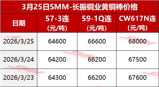 【SMM价格】2026年3月25日长振黄铜棒价格
