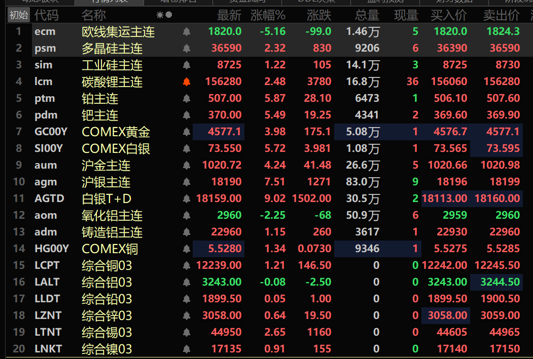此外,铸造铝主连期货涨1.15%,氧化铝主连跌2.25%。碳酸锂主连涨2.48%。工业硅主连涨1.22%。多晶硅主连涨2.32%。
