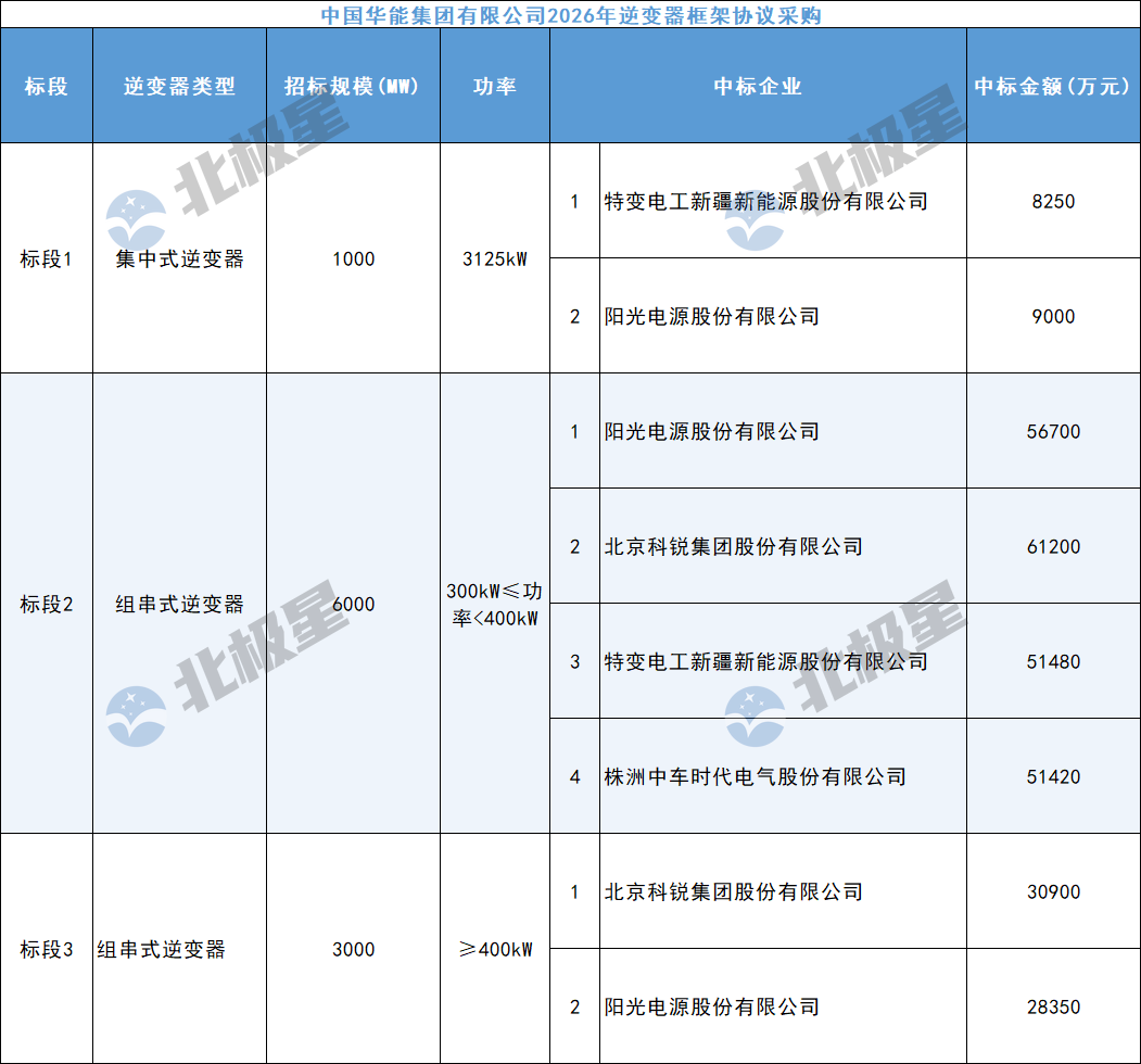 3月23日,华能2026年逆变器框架协议采购招标(标段二)中标结果公示,中标企业有阳光电源股份有限公司、北京科锐集团股份有限公司、特变电工新疆新能源股份有限公司、株洲中车时代电气股份有限公司。
