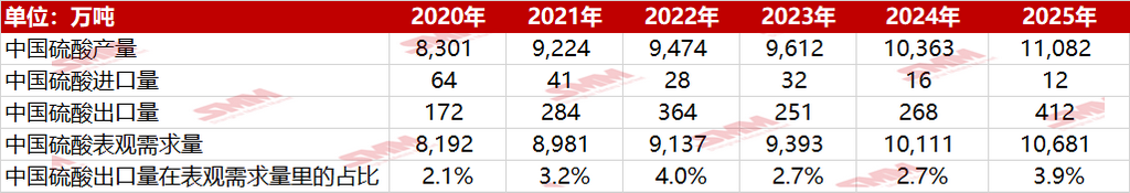从供需基本面看,中国硫酸市场高度内循环。数据显示,2020年至2025年,中国硫酸出口量在表观需求量中的占比从未超过4.1%,最高仅为2021年的3.2%和2025年的3.9%。即便在出口高峰年份,绝大部分产量仍由国内消化。2025年中国硫酸产量达11082万吨,表观需求量10681万吨,出口量仅412万吨。如此庞大的内需市场,使得政策调控具备天然基础——保国内优先于争出口,既是政治任务,也是市场现实。